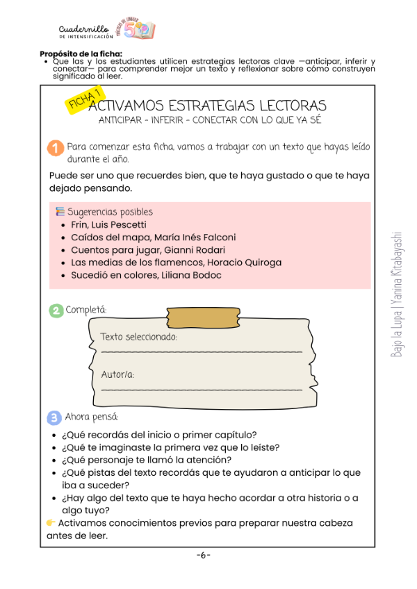 Incluye 10 fichas listas para usar, actividades con sentido, organizadores visuales, estrategias del buen lector, espacios de autoevaluación y una ficha extra de repaso final.