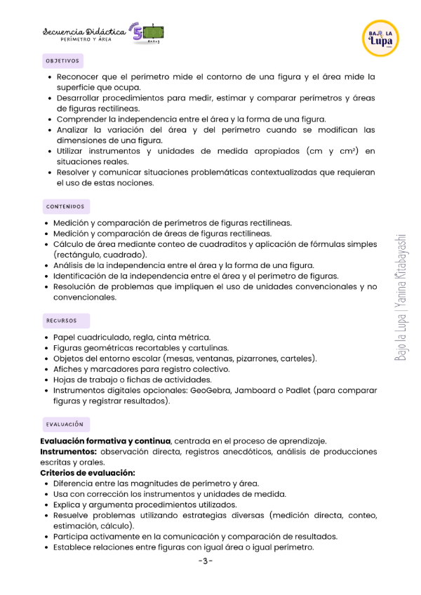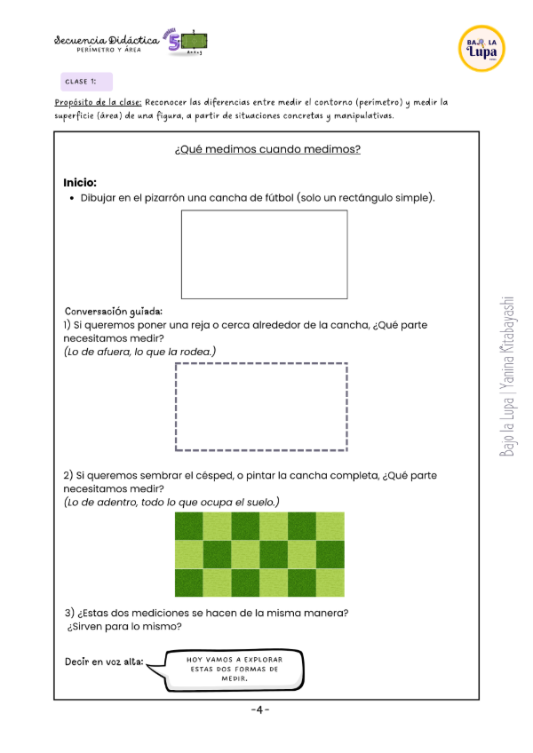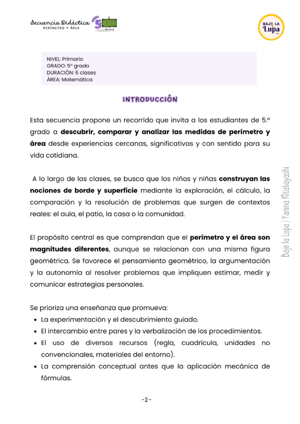 Este material propone una secuencia didáctica paso a paso para enseñar perímetro y área desde experiencias reales, significativas y concretas. Se parte de la exploración con objetos del aula y situaciones cotidianas, para luego avanzar hacia la construcción conceptual y el uso de la multiplicación como estrategia eficiente para calcular el área en rectángulos.