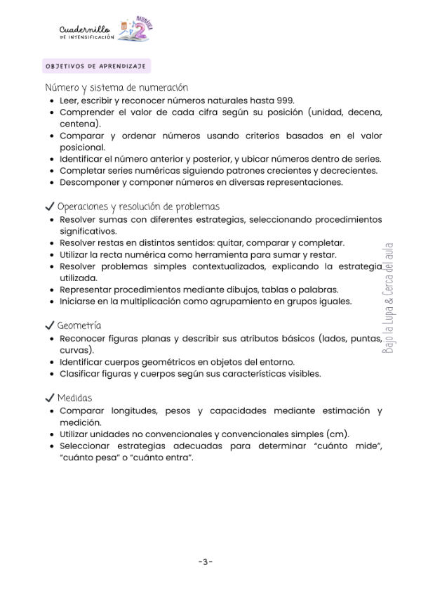 Trabaja numeración hasta 999, valor posicional, series, sumas y restas con diferentes estrategias, problemas, iniciación a la multiplicación, figuras geométricas y medición con unidades no convencionales y convencionales.